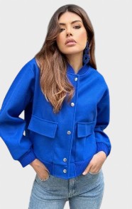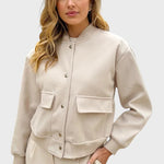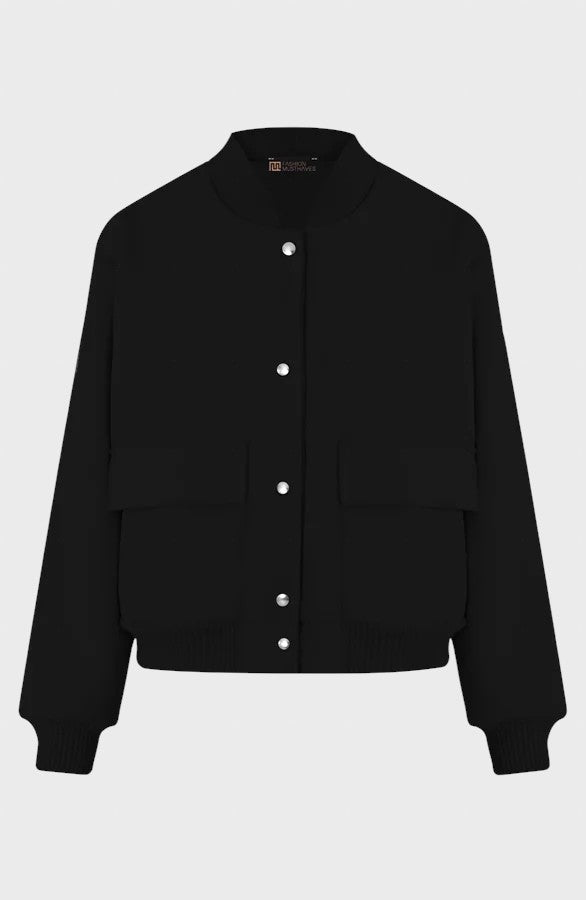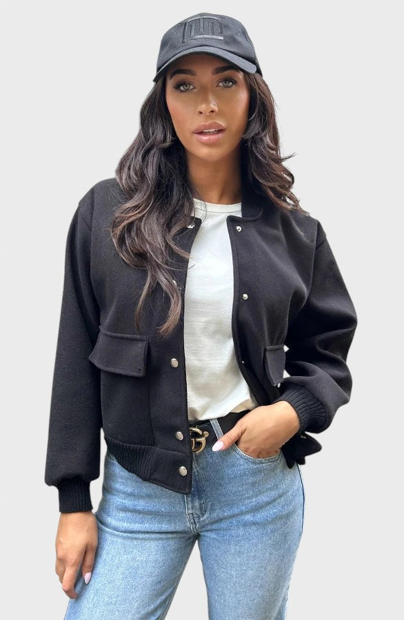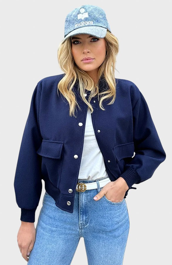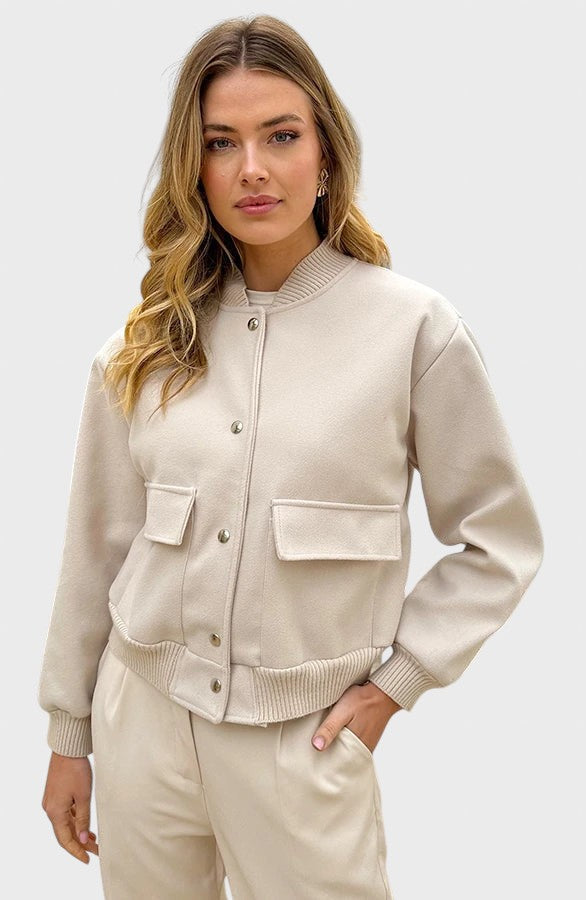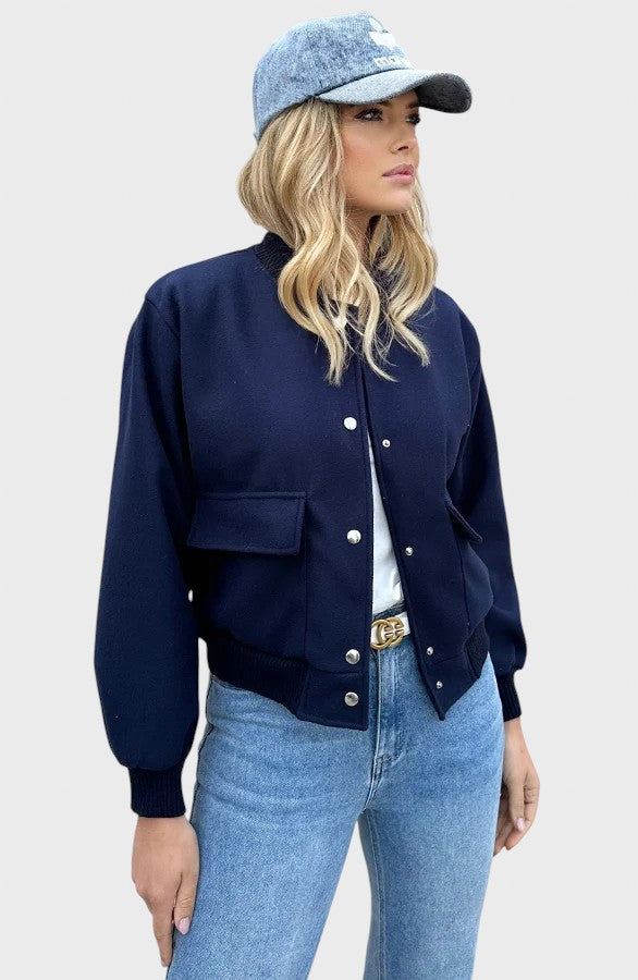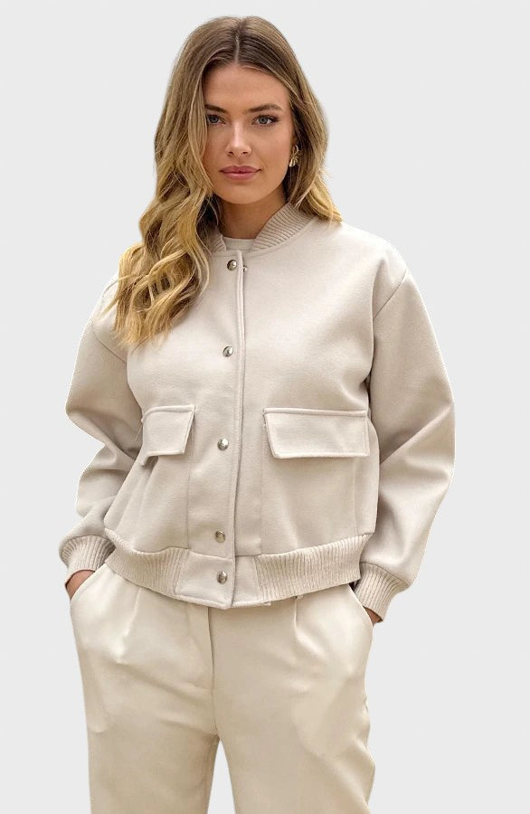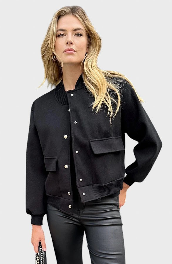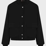 • Изискани дизайнерски детайли: Класическият силует на бомбър и сребристото закопчаване с тик-так копчета добавят модерен, изящен щрих.