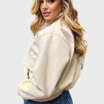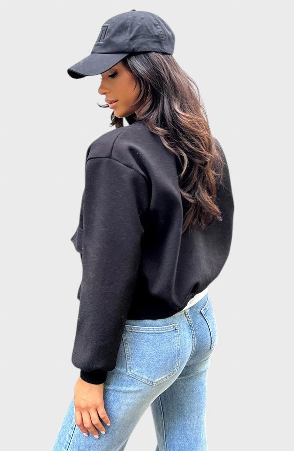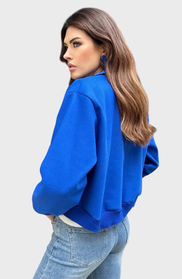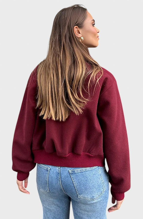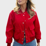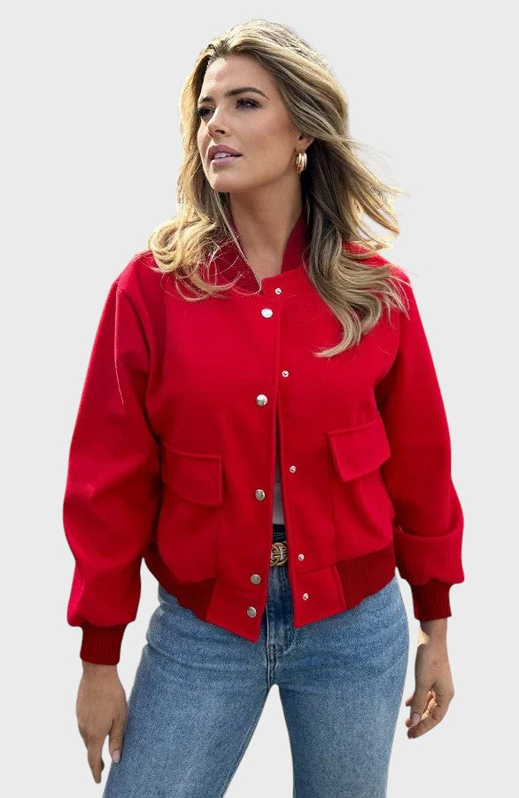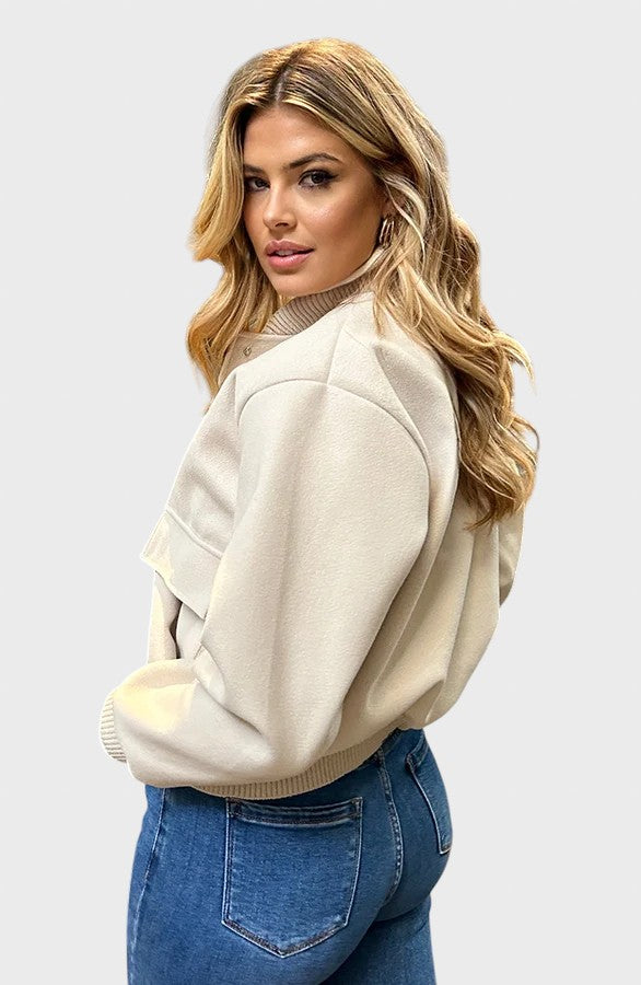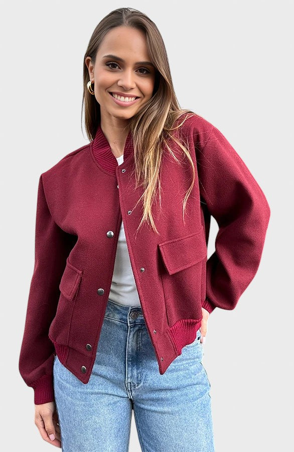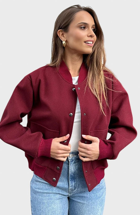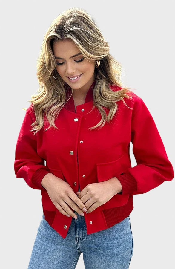 • Изискани дизайнерски детайли: Класическият силует на бомбър и сребристото закопчаване с тик-так копчета добавят модерен, изящен щрих.