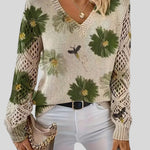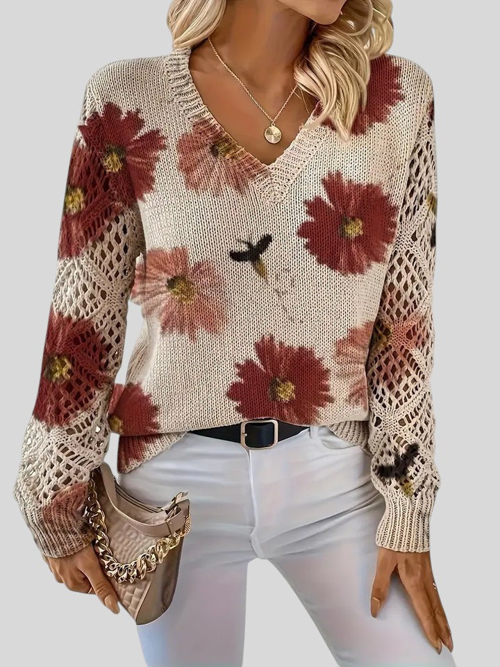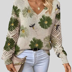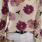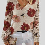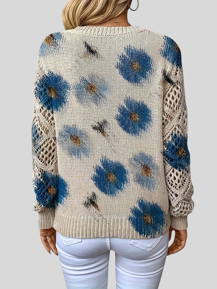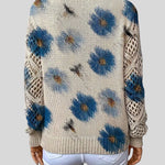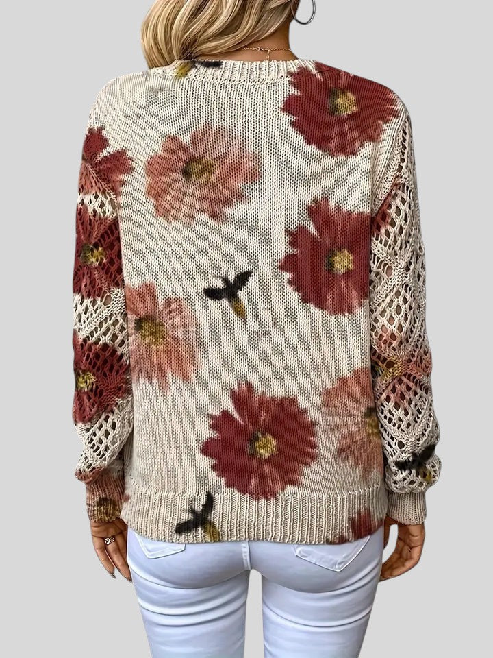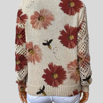 Този пуловер съчетава комфорт и артистичен дизайн, което го прави идеалната дреха, която ще добави нотка цвят и текстура към вашия ежедневен вид . Тялото на пуловера е с плътна бежова плетка, която служи като платно за ярък флорален мотив. Цветята са големи и богато оцветени, с малки детайли, които изглеждат като пчели или насекоми, летящи над тях, придавайки му естествен и игрив вид.