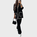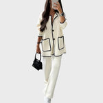 • Структуриран дизайн: Състои се от плетено яке тип кардиган с копчета за закопчаване и панталони с права или леко разкроена кройка. Акцентите в дизайна са контурите и декоративните джобове, които са с контрастно цветно покритие, добавяйки дефиниция и изискан вид на дрехата.