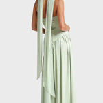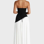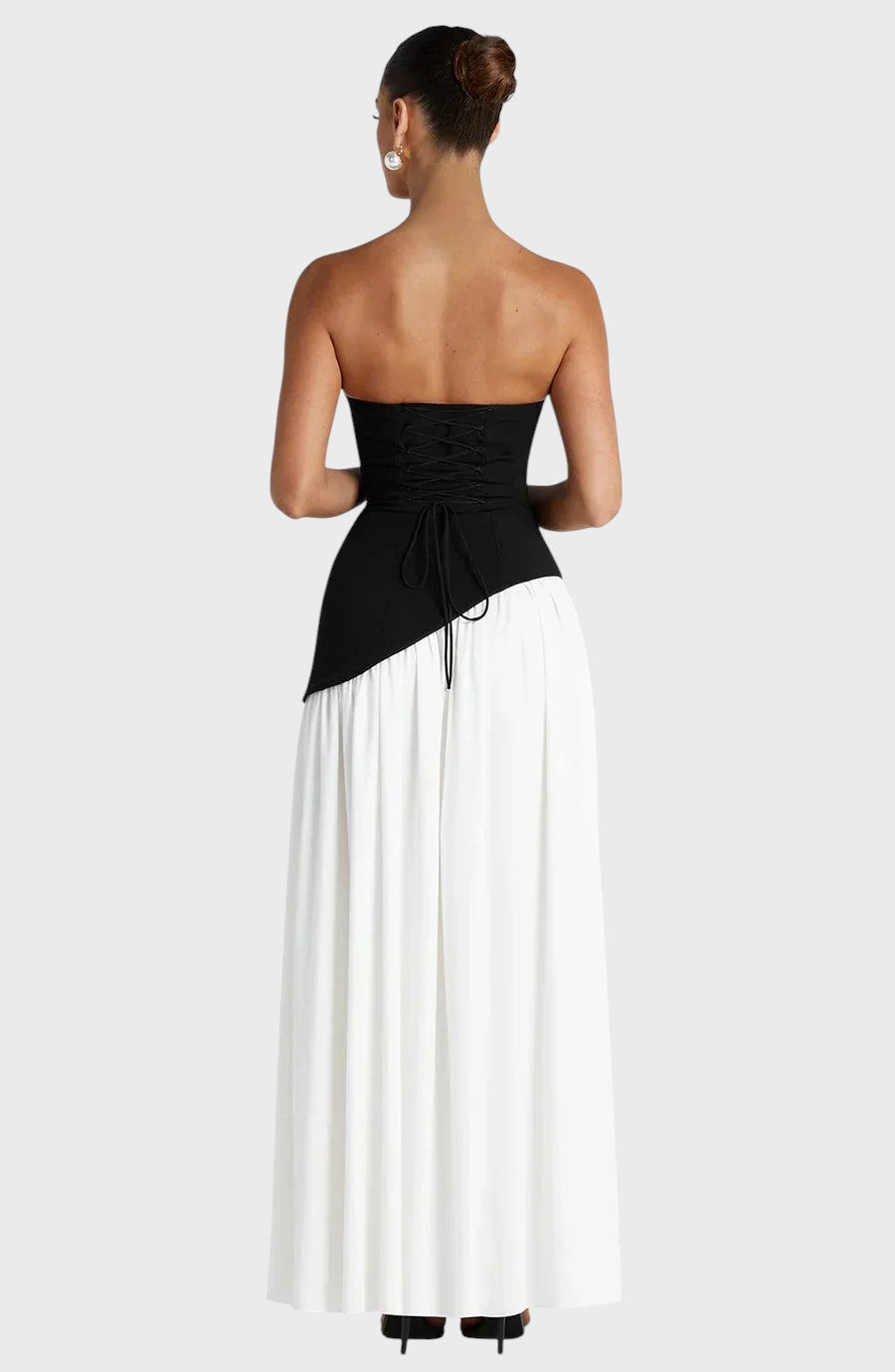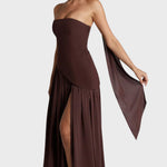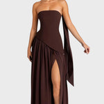 • Универсален и вечен дизайн: Роклята е със структурирана, асиметрична талия, която пада ниско върху ханша, създавайки елегантно наслояване. Дългата, ефирна пола осигурява леко и драматично движение с всяка стъпка.