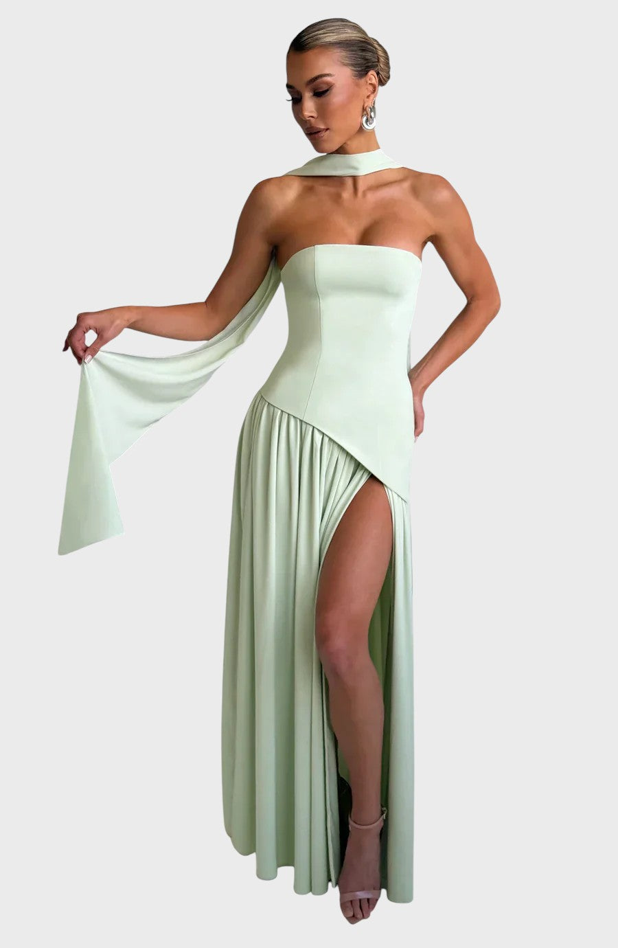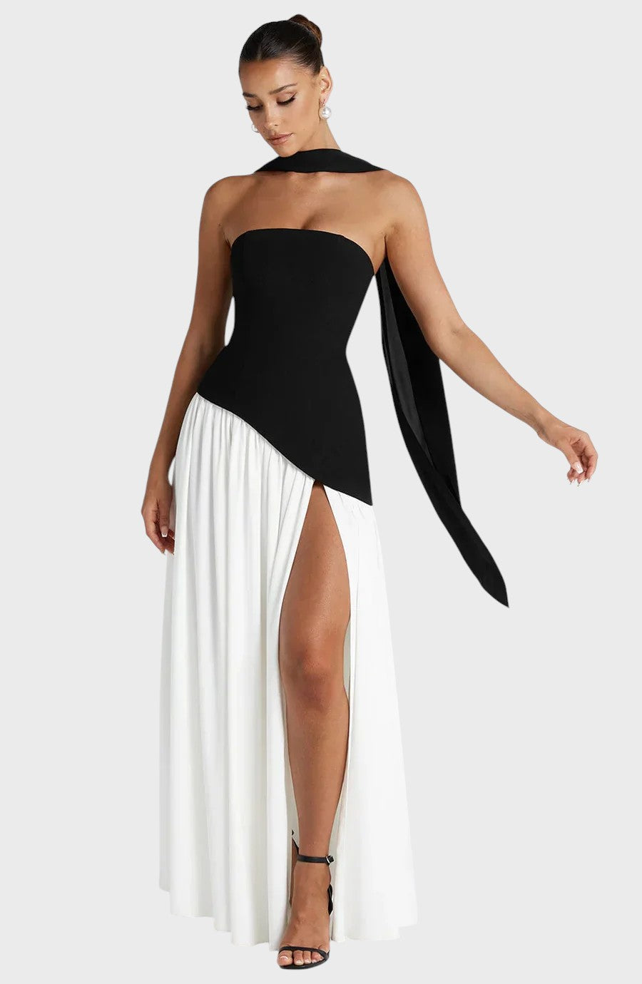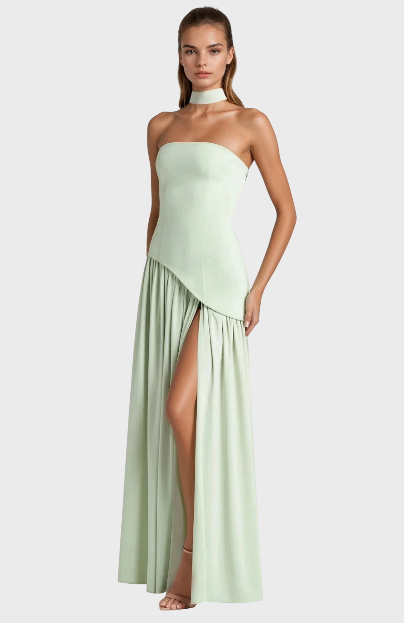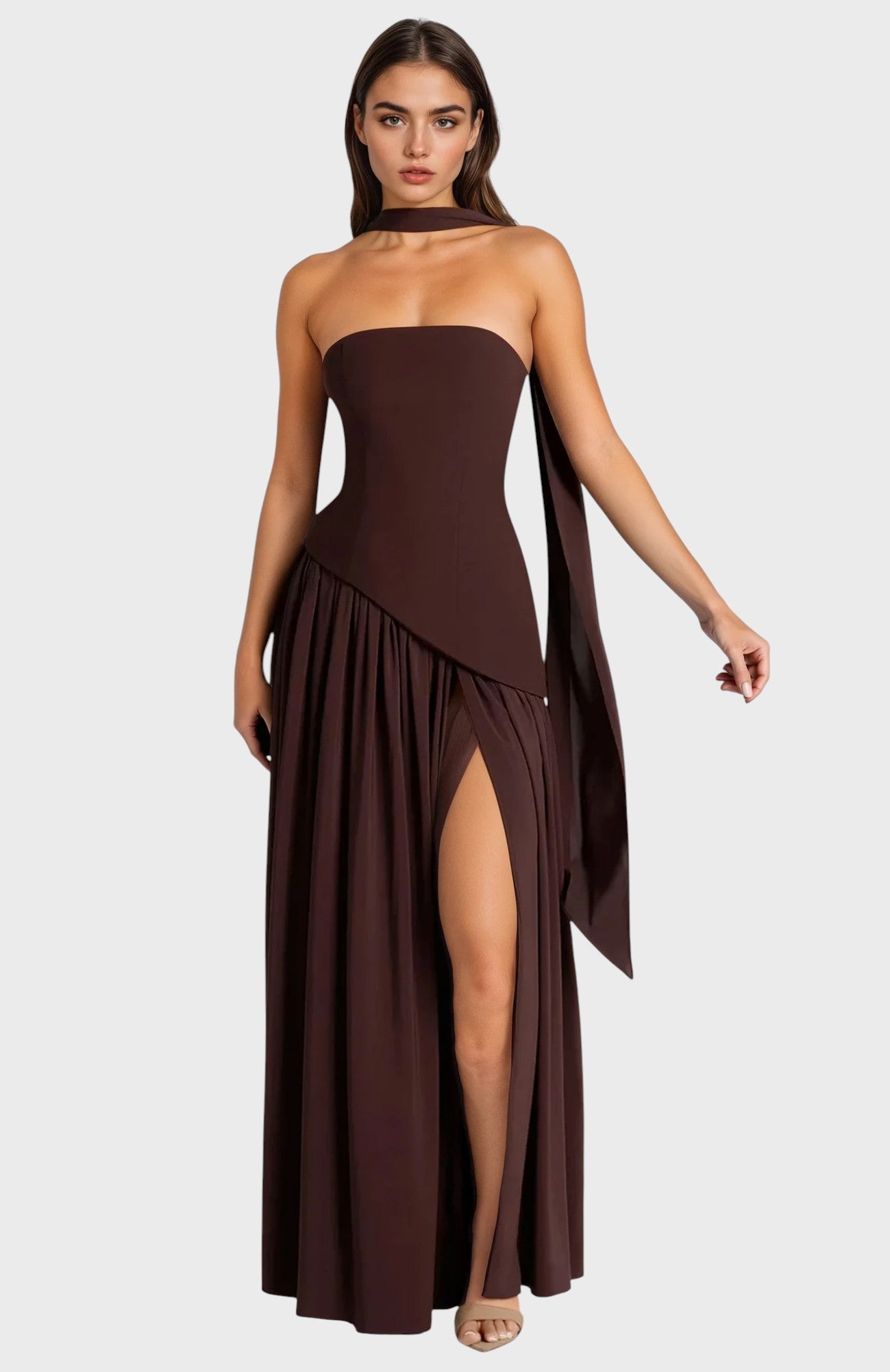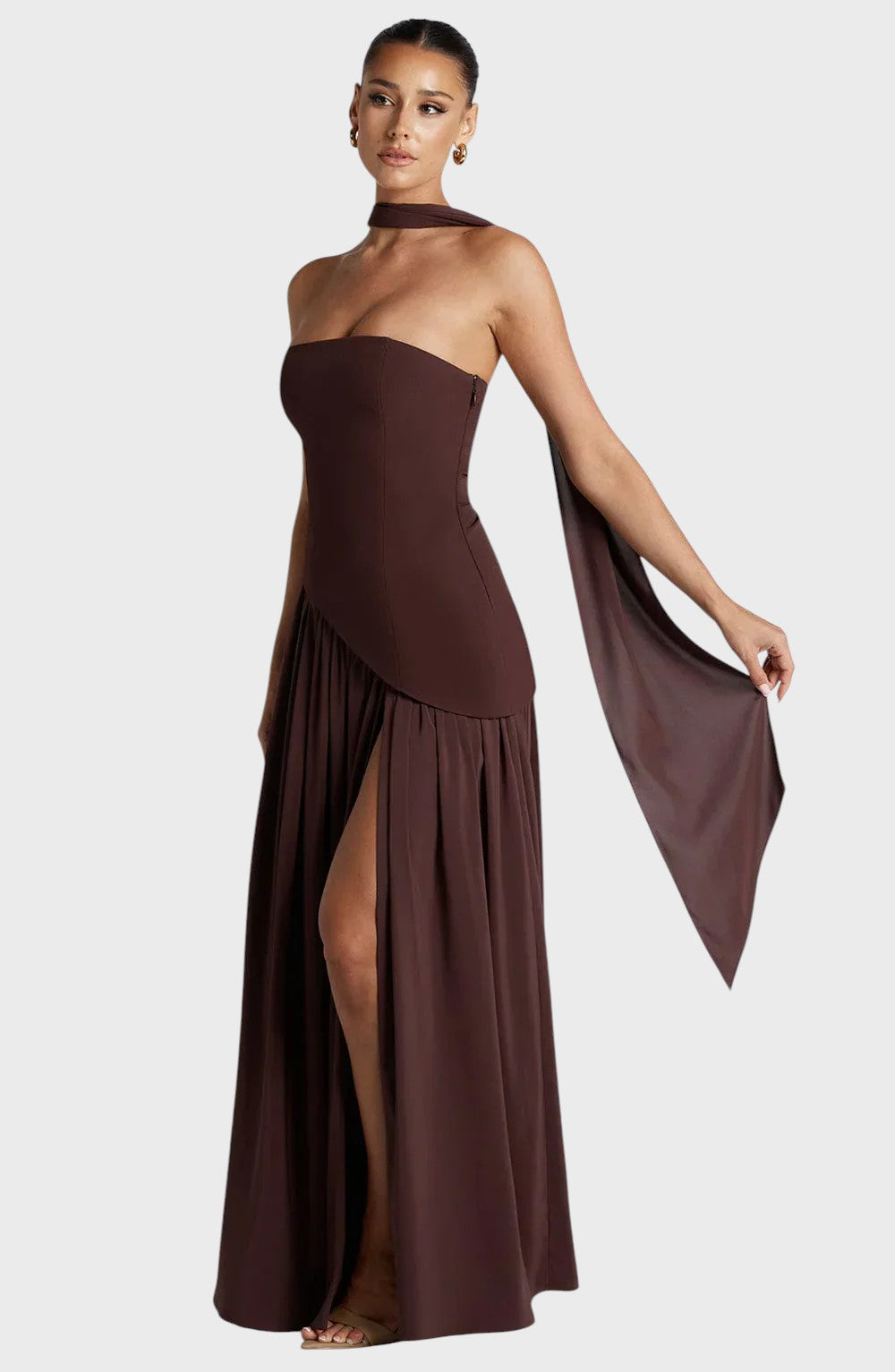 • Иновативно деколте: Деколтето тип „бандо“ е допълнено от деликатна презрамка, която се увива около врата. Този детайл добавя архитектурна изтънченост, елегантно рамкирайки раменете.
