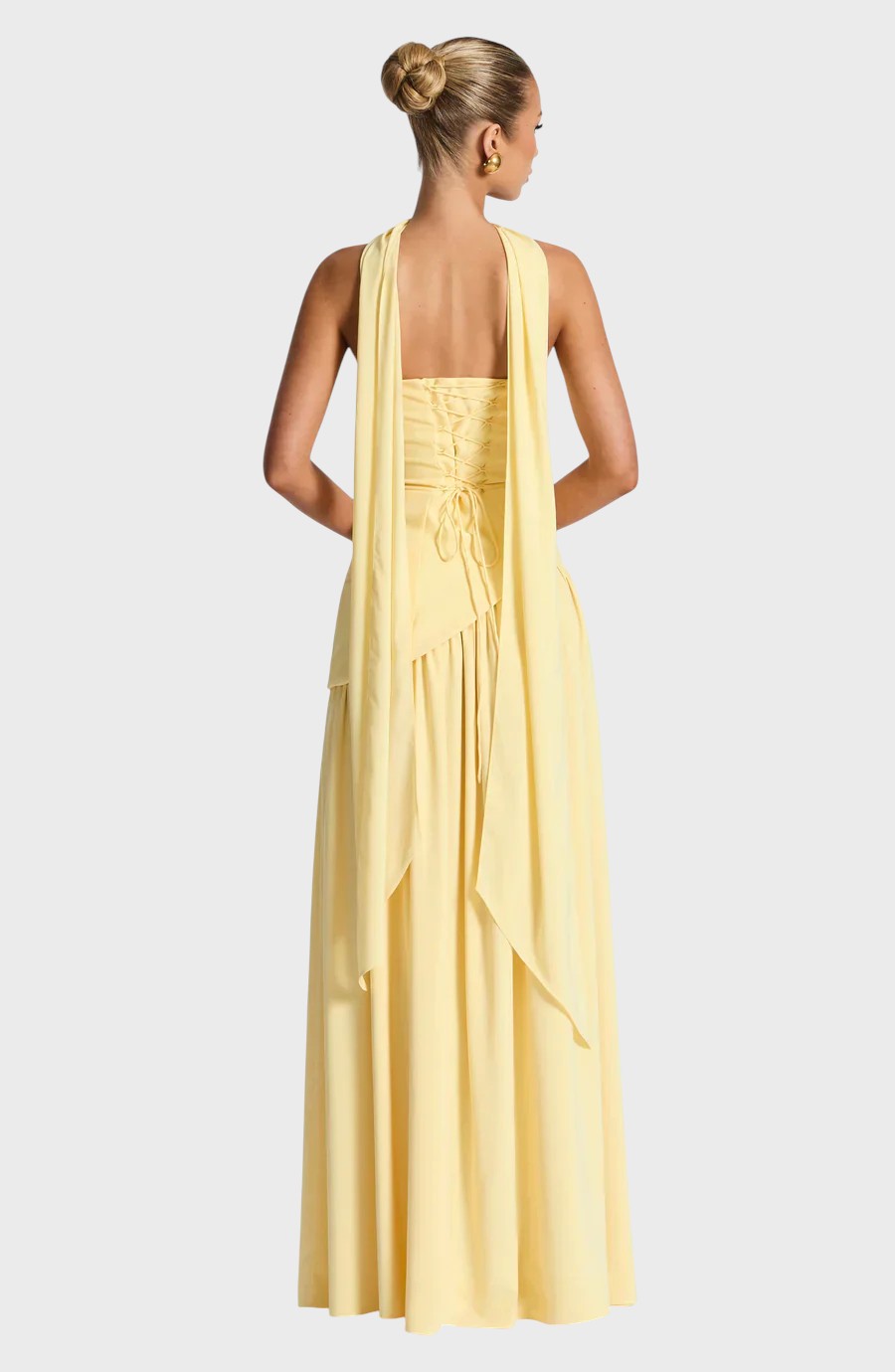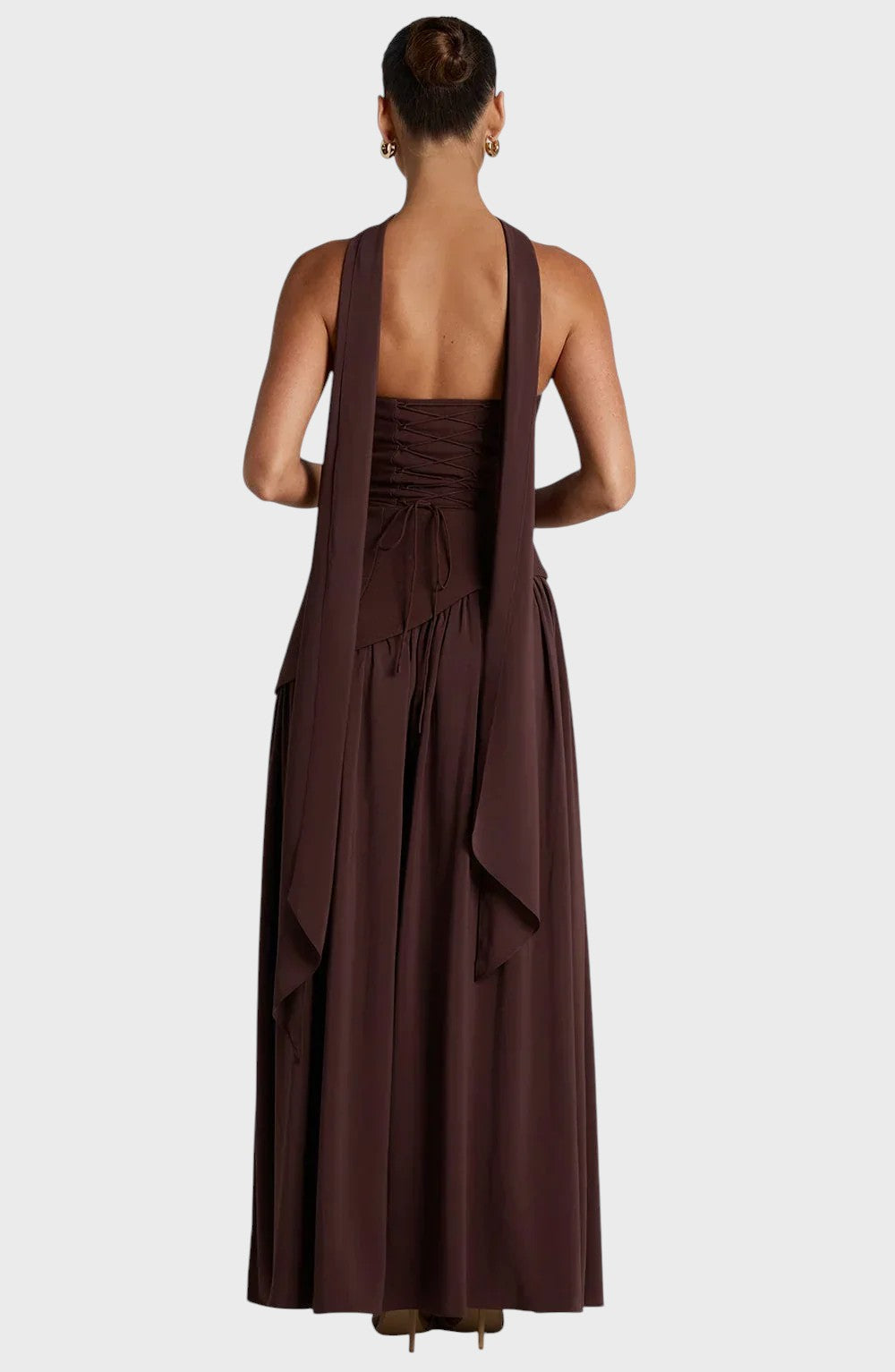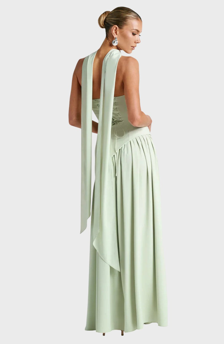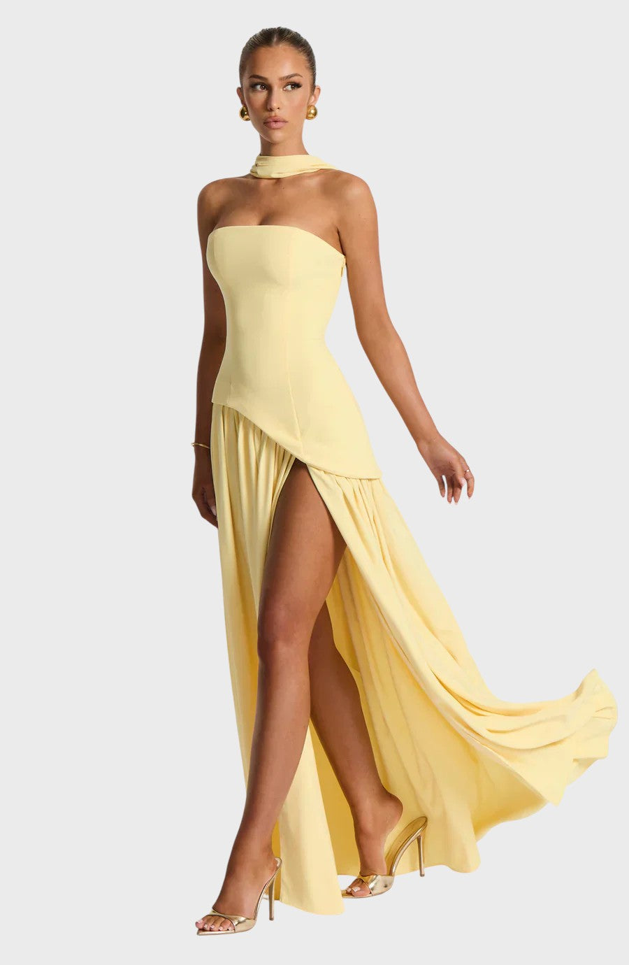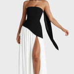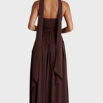 • Иновативно деколте: Деколтето тип „бандо“ е допълнено от деликатна презрамка, която се увива около врата. Този детайл добавя архитектурна изтънченост, елегантно рамкирайки раменете.