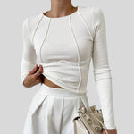 Оребрената му материя добавя текстура и еластичност, осигурявайки плътно и удобно прилягане. Това, което го прави специален, е видимият шев, който създава геометрични линии отпред, подчертавайки силуета. Това е универсална дреха, която се откроява със своята изискана простота и дизайнерски детайли.